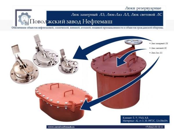 Резервуарные люки — это важнейший элемент обвязки любого вертикального (РВС) или горизонтального (РГС) стального резервуара (танк — контейнера, цистерны, бака и т.п.) для хранения нефти, нефтепродуктов, воды и других жидкостей. Они служат для доступа персонала, обслуживания, осмотра, ремонта, очистки или загрузки/выгрузки содержимого, вентиляции и контроля.